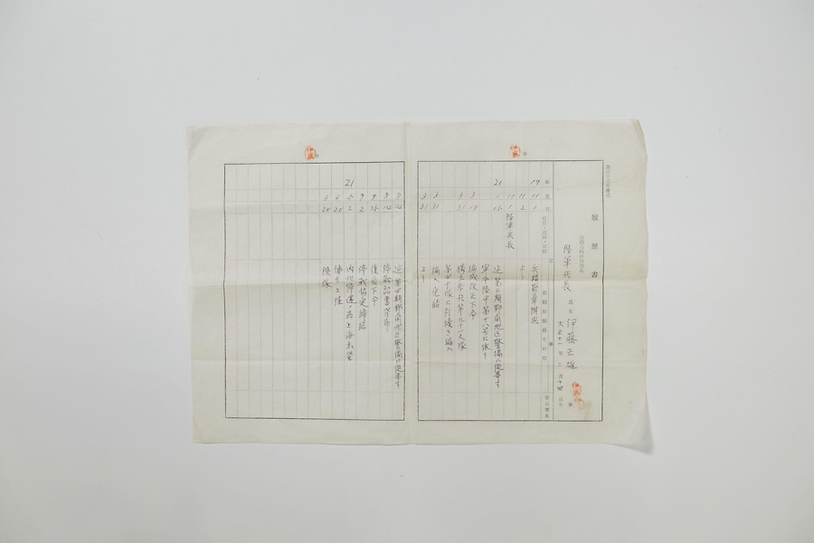 戦争関連資料〈写真〉 戦場・軍隊生活 証書・記念品 人びとの生活 子どもの生活 戦場・軍隊生活 陸軍兵長履歴書・従軍証明書 クリックで拡大します 提供者 堤 和子 様 時期 昭和17年 (1942年) ~昭和20年 (1945年) 頃 場所 中国 説明 お父様は、昭和17年 (1942年) に陸軍に入隊後、長安などの中国各地で部隊の警備に従事した。 この提供者の他の資料 陸軍自動車操縦技量証明書 「戦場・軍隊生活」の資料一覧へ シェア ポスト
