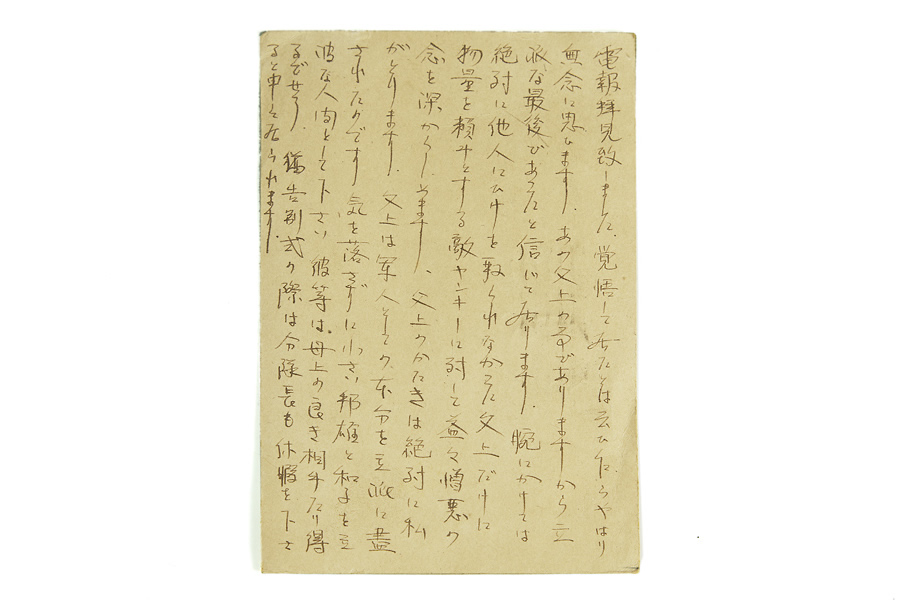 戦争関連資料〈写真〉 戦場・軍隊生活 従軍・抑留・帰還 人びとの生活 子どもの生活 戦場・軍隊生活 母へ宛てたハガキ クリックで拡大します 提供者 川又 茂樹 様 時期 昭和19年 (1944年) 場所 神奈川県横須賀市 説明 叔父である髙橋忠雄さんが自身の母高橋ハクさんに宛てたハガキ。髙橋忠雄さんの父髙橋一松さんの戦死を受けて、綴ったものだと思われる。 この提供者の他の資料 ガラス乾板と写真 名刺 特別大演習觀艦式後の賜饌の招待状 紀元二千六百年式典の案内状 敍勲二等授瑞寶章の勲記 大日本帝國外國勲章佩用免許證 「戦場・軍隊生活」の資料一覧へ シェア ポスト