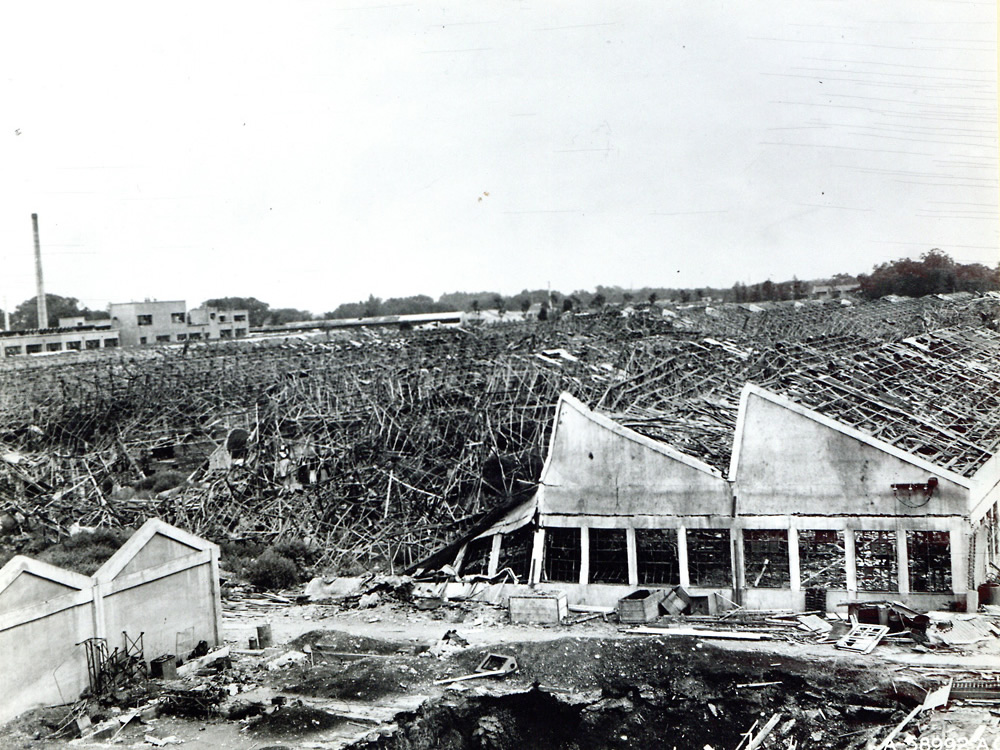 中島飛行機は、日本を代表する航空機メーカーで、戦時中は多くの軍用機やエンジンの生産を行っていました。武蔵製作所は、約4万5千人から5万人もの従業員が働き、国内生産の大きな割合を占めていました。そのため、米軍はこの工場を攻撃目標とし、昭和19(1944)年11月24日に空襲を行いました。これが首都圏におけるB-29爆撃機による空襲の始まりとされています。その後も空襲は複数回行われ、工場だけでなく周辺の住宅地にも被害が及び、多くの人々が犠牲になりました。